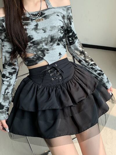 韓国ファッション プリーツスカート レディーススカートハイウエストメッシュブラックレースアップモデル JK制服ミニスカート