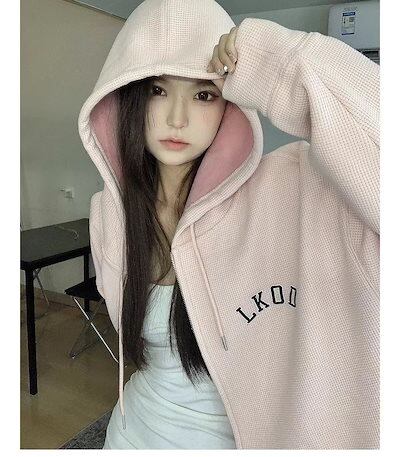 パーカー ピンク ワッフルチェック レディース 秋 新作 パーカー カーディガン