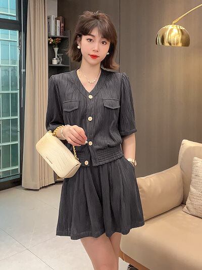 涼しく楽ちんセットアップ 夏のプリーツしわ寄せスーツ 半袖上 着+パンツオーバーサイズ レディース 韓国ファッション