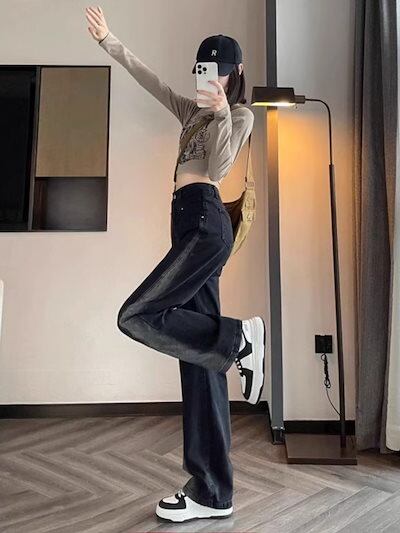 デニムパンツ ハイウエスト ワイドパンツ ジーンズ レディース 秋冬 ルーズ 薄手 ドラッグライン ストレートパンツ