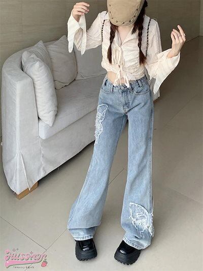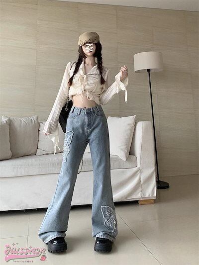 ハイウエスト フリンジ デニムパンツ ボトムス レッグ ゆるダボ ジーンズ ゆったり カジュアル ストリート 切りっぱなしカットオフ 加工 肌見せ ジーパン ファッション 秋 冬 春 スタイルアップ | HUG-L