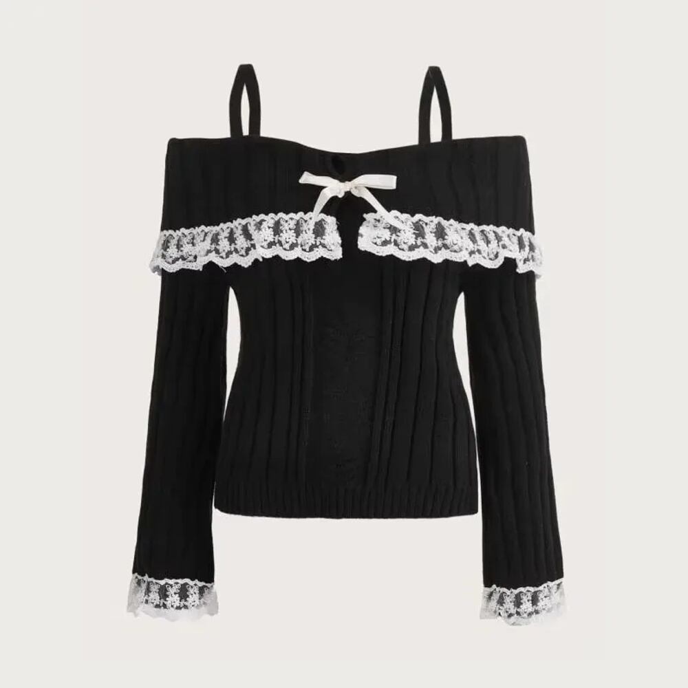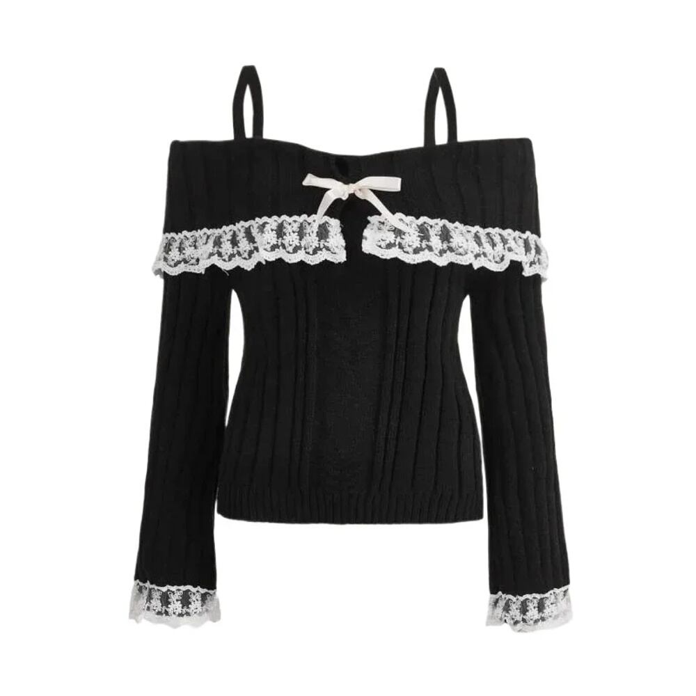 Deeptown-女性の裸の肩のセーター、ニットプルオーバー、ピンクの美学、長袖、甘い、カワイイ、レース、かわいい、y2k T240926103421_01