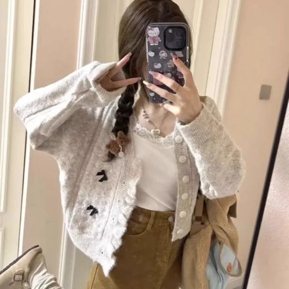 Deeptown-グレーのニットカーディガン,韓国スタイル,快適な原宿セーター,カジュアルな美学,エレガントなリボン,若者のためのアウターウェア,秋 T240926104312_01