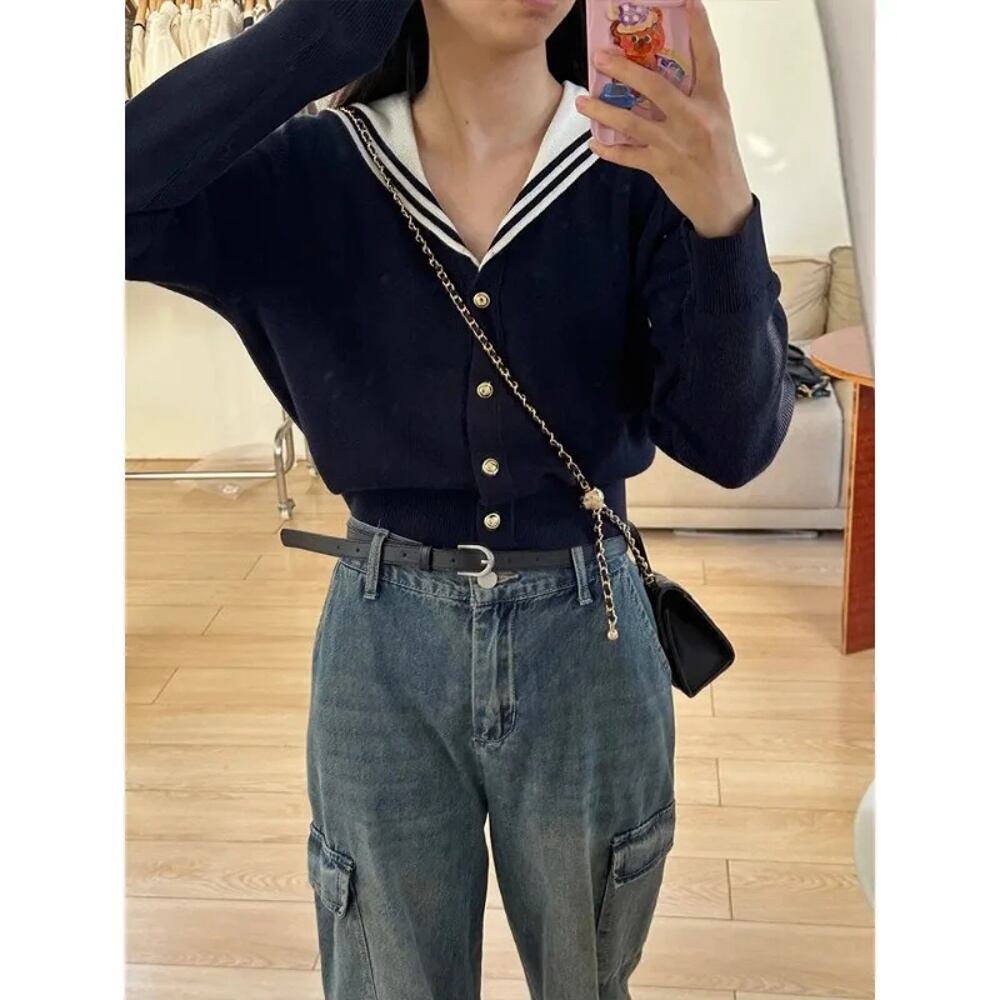 Deeptown-女性のセーラーカラーカーディガン、プレッピーベーシックセーター、韓国スタイルのニットウェア、ホワイトジャンパー、日本の美的、ヴィンテージ、春 T240926104427_01 | HUG-L
