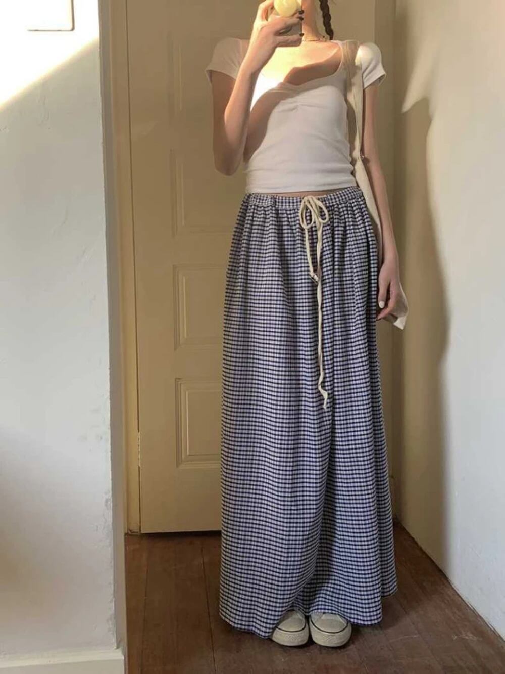 Deeptown-女性の市松模様のチェックスカート,青,ハイウエスト,台形,カジュアルファッション,マキシビーチスカート,夏 T240926104545_01