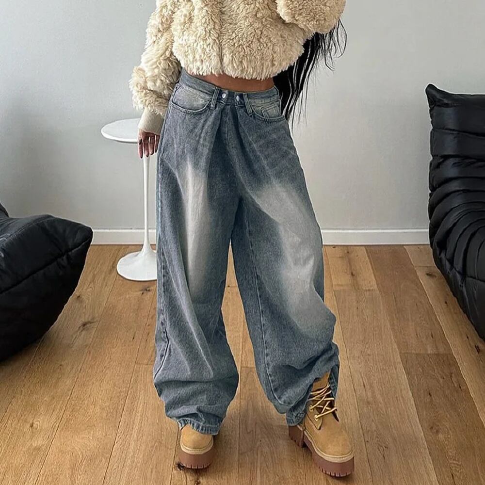 Deeptown-レディースy2kバギーワイドレッグジーンズ、ヴィンテージストリートウェア、ウォッシュドオーバーサイズデニムパンツ、ベーシックだらしないブルーパンツ、秋 T240926104614_01 | HUG-L