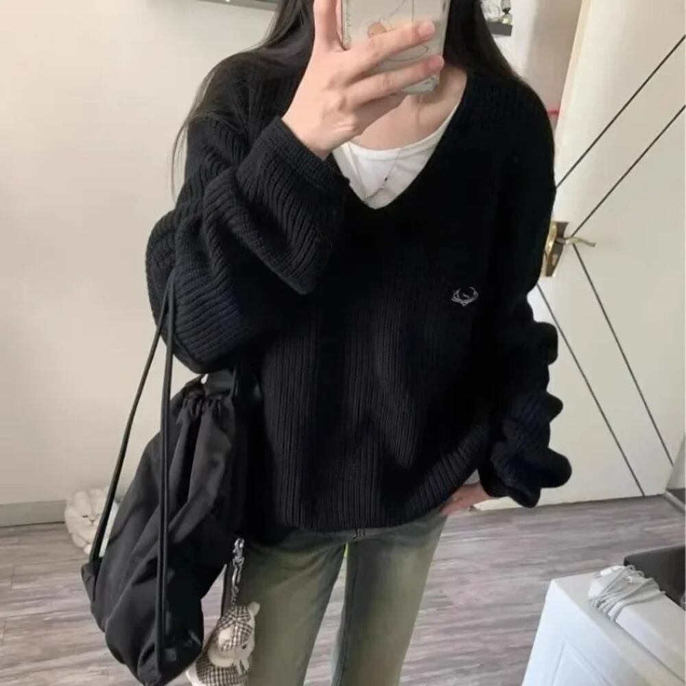 Deeptown-女性のヴィンテージブラックセーター,ルーズニットセーター,Vネックジャージ,特大,韓国ファッション,カジュアル原宿,秋 T240926104826_01