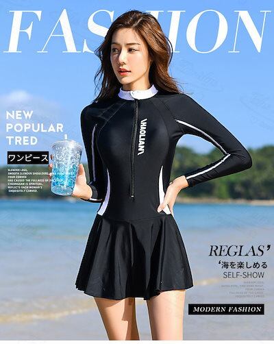 フィットネス水着 レディース スポーツ水着 韓国 体型カバー ワンピース ラッシュパーカー 長袖 ママ水着 着痩せ 見せパン 潜水服 サーフスーツ 大きいサイズ ショートパンツ ミセス 太ももカバー | HUG-L