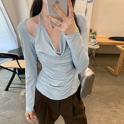 新しいスタイル 初秋 ロンT ワンラインカラー 薄手 トップス プリーツ ストラップレス 長袖Tシャツ
