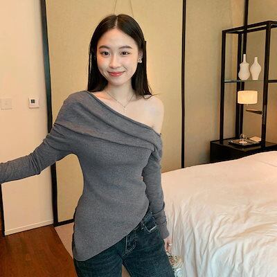 ロングスリーブ スプリット ニット レディース 初秋 ストラップレス ブラウス トップス ロンT ワンラインネックライン