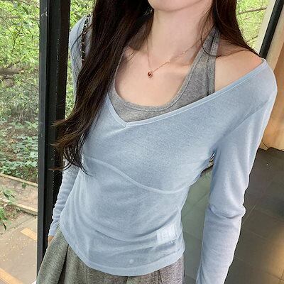ほんのり透ける ブラウス Vネック 秋 ロンT 吊りネック 新しいスタイル Tシャツ レディース