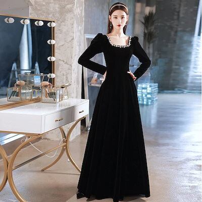 披露宴 フレンチヴィンテージ 花嫁 演奏会 ドレス二次会 ドレス ゴールドベルベット長袖 ワンピース 春ブラック 高級感長袖 ドレス パーティードレス 冬 発表会 ワンピースパーティードレ | HUG-L
