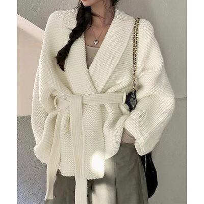 ニットカーディガン 秋冬 リブニット ベルト付きニットカーディガン レディース
