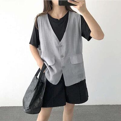 ベスト レディース おしゃれ サマーベスト ジレ ジレベスト 春夏 Vネック 綿麻風 羽織 前開きベスト カジュアル 無地 レイヤード ベスト きれいめ