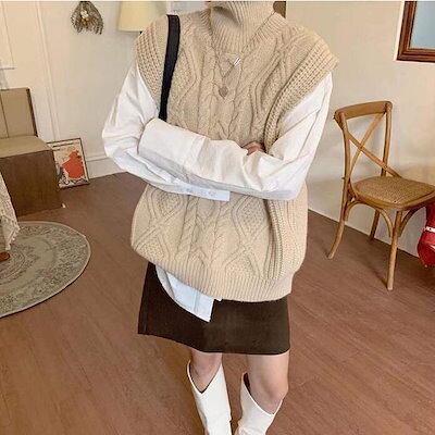 ニットベスト セーター ニット レディース ベスト 秋 冬 コーデ ハイネック ニット ケーブル編み リブ編み セーター 重ね着 ゆったり カジュアル お出かけ