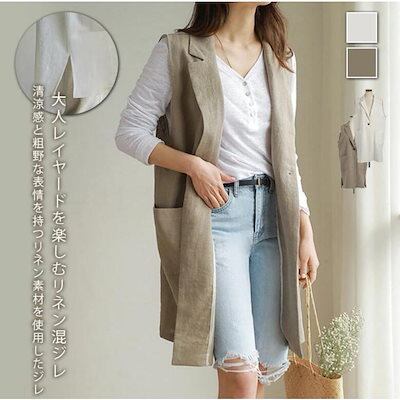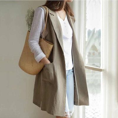 ジレベスト レディース 春夏 ロングジレ リネン テーラードジレ 綿麻 トレンチベスト テーラード風 無地 ジレンチ トップス ロングベスト 春 秋 夏