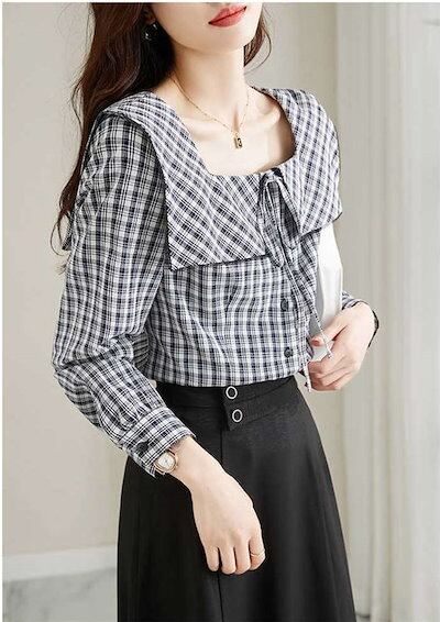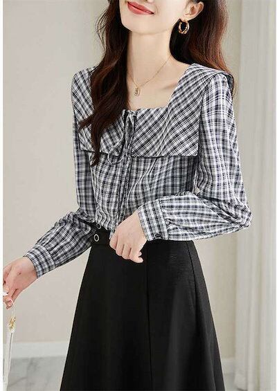 ビッグカラーブラウス レディース ギンガムチェック リボン 前ボタン 長袖 スクエアネック モノクロ ブラウス レディース 長袖 春秋 フォーマル 大きいサイズ ス オフィス ゆったり オシャレ 上品 | HUG-L