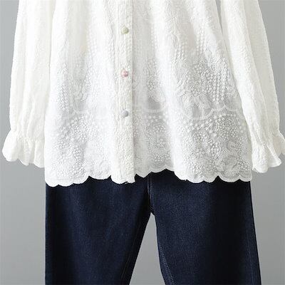 シャツ レディース 長袖 シャツ お洒落 オフィス ブラウス ガーゼ 春 夏 綿100% 花柄刺繍 コットン ビッグカラー シンプル トップス 体型カバー きれいめ カーディガン 前開き 大きいサイズ | HUG-L