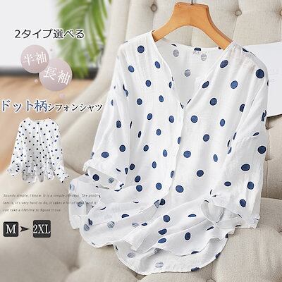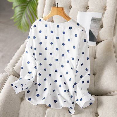 シャツ ブラウス レディース トップス 春 夏 長袖 ドット柄 水玉 バルーン袖 シフォン 前開き プリント ゆったり ラウンドネック 柔らか シンプル ボタン 通気性 大きいサイズ 通勤 OL きれ | HUG-L