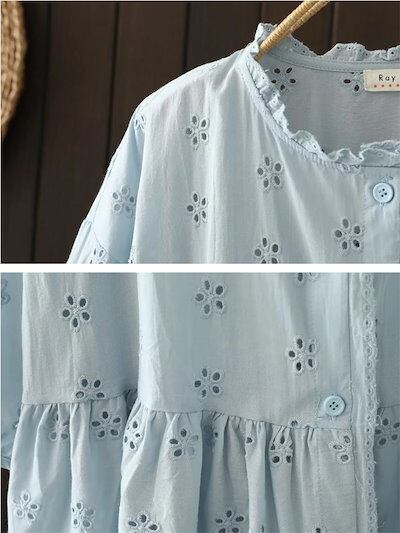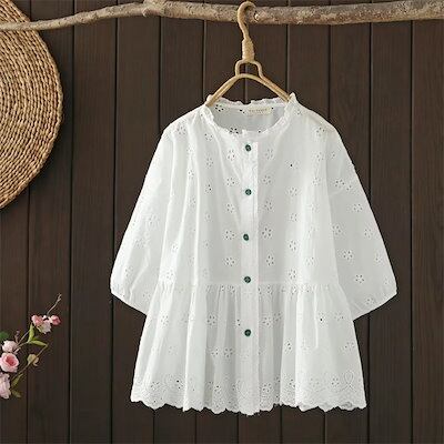 シャツ ブラウス トップス レディース コットンレースブラウス ボリューム袖 綿100% チュニック 夏 花柄 五分袖 刺?花柄 レース フリル襟 トップス 立ち襟シャツ 森ガール キレイめ カジュ | HUG-L