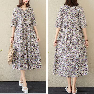 ワンピース 秋 ワンピ ロングワンピース 膝下 花柄 半袖 五分袖 ミモレ Vネック ロングワンピ レディース ロング 大きいサイズ パーティー 夏 春 秋 マタニティ花柄 総柄 きれいめ おしゃれ | HUG-L