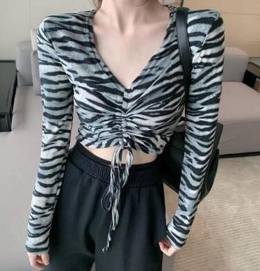 秋冬新作 レディース 女 トップス Vネック ゼブラ柄 ニット セーター Tシャツ インナー カットソー