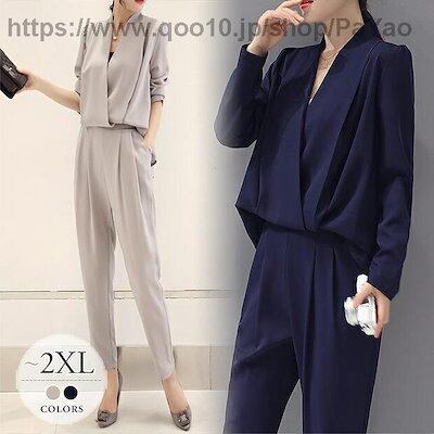 パンツドレスパンツスーツ二点セットスーツセットセットアップVネック体型カバー着痩せ大きいサイズママ母親他と被らない/