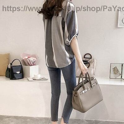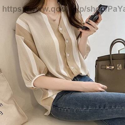レディースファッショントップスデートシャツブラウスカットソー袖あり7分袖七分袖Vネックロングテールスリット襟なしスリム細身前開き柄ストライプモードXL2XL3XL4XL大きいサイズ102030