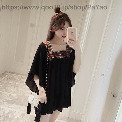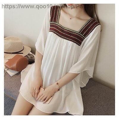レディースファッショントップスレディースブラウスカットソー袖あり五分袖フレアスリーブウエストマークギャザーボヘミアンスクエアネック無地ホワイトブラックXL2XL3XL4XL大きいサイズ102030