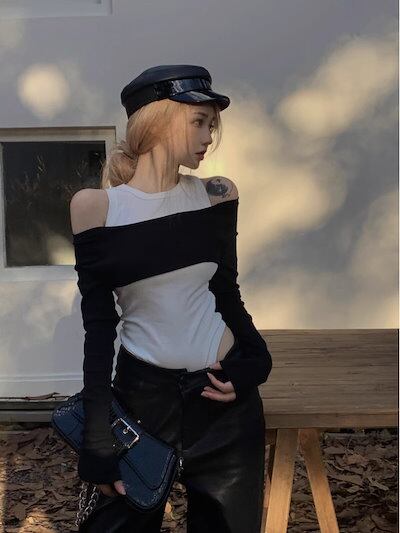 2024秋 長袖 Tシャツ ショート丈 カットソーワッペンK-POPトップス カジュアルタンク 韓国系ストリートへそ出しタイトネックスリーブ 肌見せ T ファッションレディースかわいいサイド衣装風冬