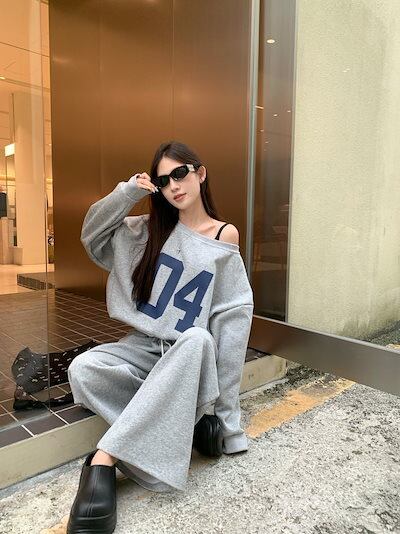 2024 秋冬 トップス 長袖トレーナーかわいいラウンドネックTシャツ肌見せレディース ストレート 韓国風ルーズゆったりカジュアル おしゃれサイズ シルエットファッション系コーデ衣装上下セットアップ | HUG-L