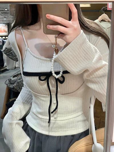 2024春夏 甘く ツーピース トップス レイヤード風 tシャツ 重ね着風 カットソー 長袖 インナー ショート タイト フィット T カジュアル きれいめ フェミニンフレンチモックネック | HUG-L