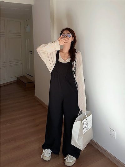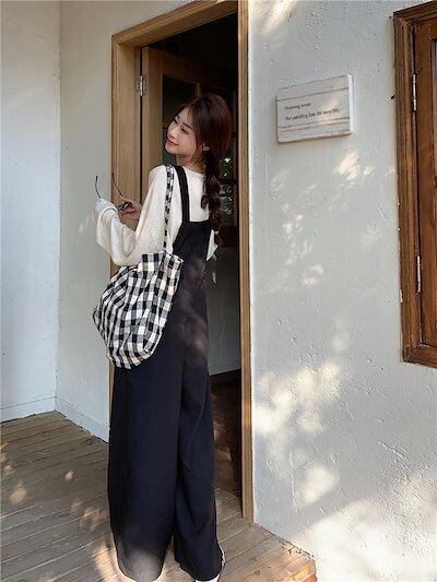 2024秋冬サロペット ロング丈 ワイド スクエアネック ハイウエスト 美脚効果 脚長効果 細見え 秋 ブラック 黒 おしゃれ かわいい 韓国ファッション レディース お出かけ
