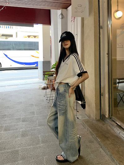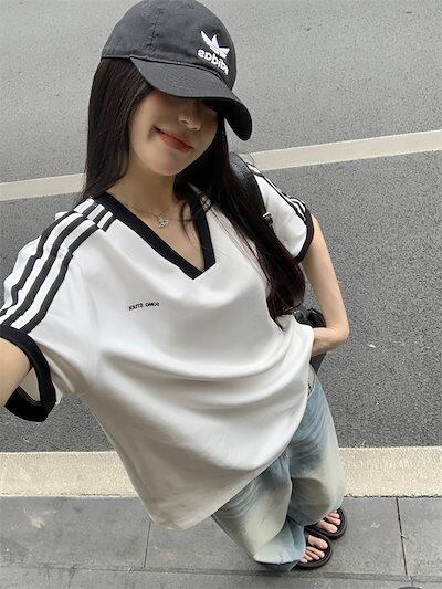 2024夏 韓国可愛い風トップス Tシャツ ロング丈ファッション 半袖スリムフィット サイド ペイントシルエット ゆったり 休日レディースサイズ韓国系ネック黑おしゃれ カジュアル メンズライク T | HUG-L