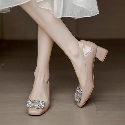 角型ハイヒールの女性太ヒール2023春の新型ヌードカラー百合スカート低ヒールエナメル中ヒールの女性ヒールパンプス韓国ファッション