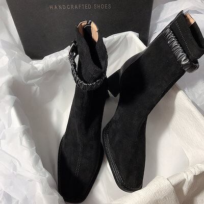 ショートブーツ 韓国ファッション 新作 気質 ステッチハイヒールエラスティックブーツシンプルスクエアトゥバックルブーツファッショナブルブーツ