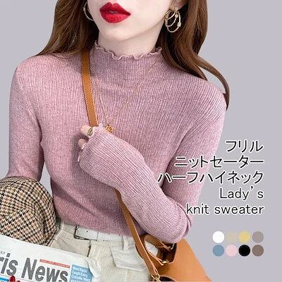 ニットセーターレディースインナー無地ハーフハイネック長袖フリル軽量リブ通気性伸縮性30%までに制限