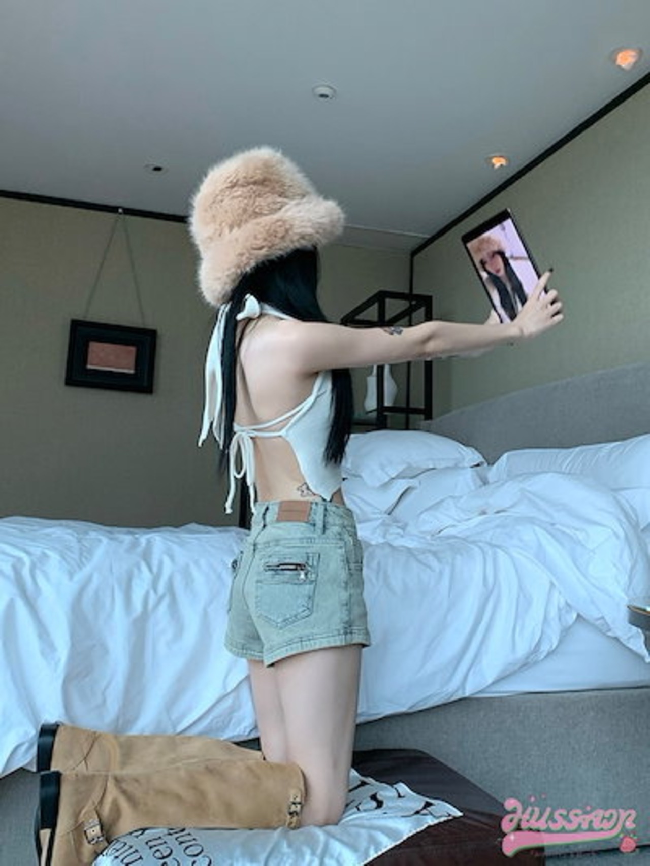 2024春夏パンツ デニム ジーンズ ショート丈 ジップ チャック ハイウエスト 脚長効果 美脚効果 細見え カジュアル かわいい おしゃれ 春 水色 ライトブルー 韓国ファッション レディース お出 | HUG-L