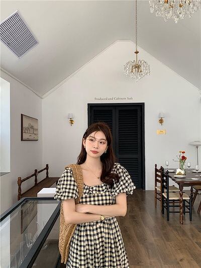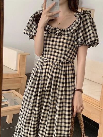 ワンピース レディース フレアワンピース ロングワンピース 半袖 パフスリーブ ロング丈 ミモレ丈 裾フレア ボリューム袖 チェック柄 ギンガムチェック ラウンワンピース春 夏 水着 ビーチツアー ワ | HUG-L
