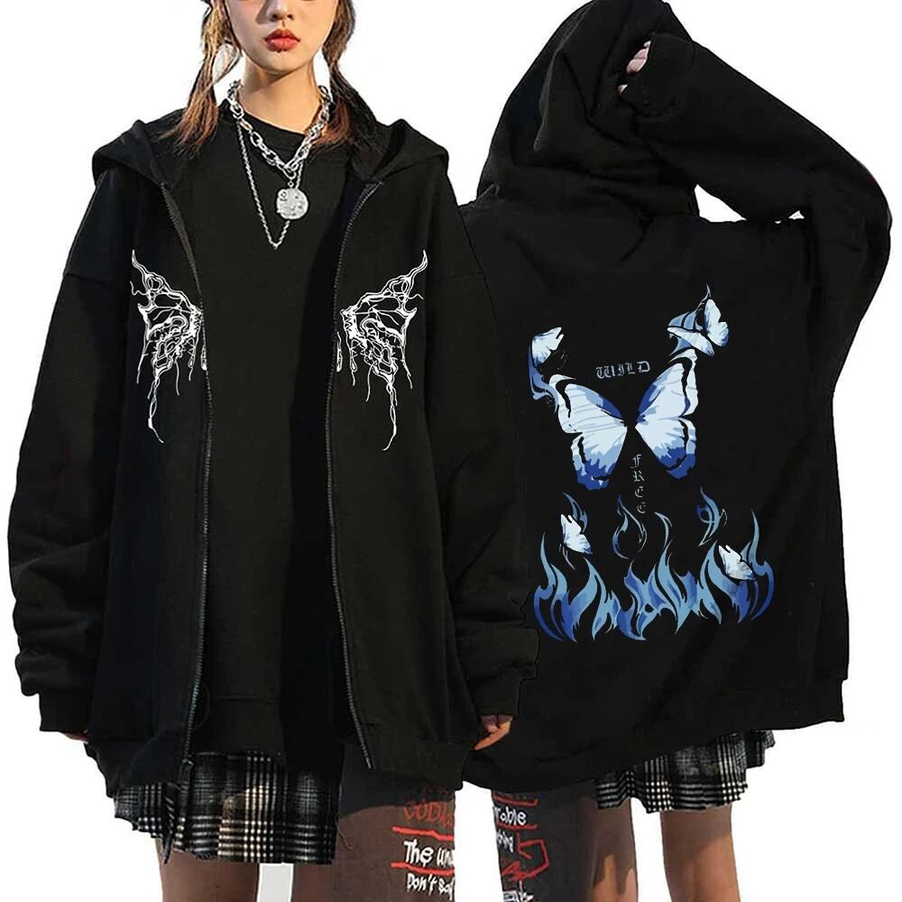 女性のヴィンテージバタフライプリントパーカー、女性のゴシックストリートウェア、ジップアップ、長袖、ポケット、ルーズスウェットシャツ、y2k、秋、冬 パーカー ジャージ y2k T240908200124_03 | HUG-L