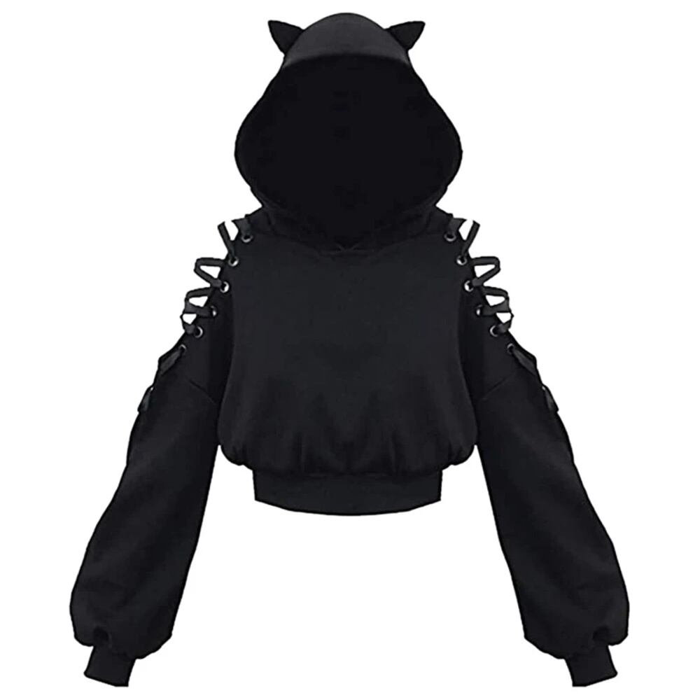 女性のゴシックキャットイヤーパーカー、長袖、フード付きスウェットシャツ、透かし彫り、レースアップ、フード付き、カジュアルプルオーバー、秋、y2k パーカー ジャージ y2k T240908200242_01