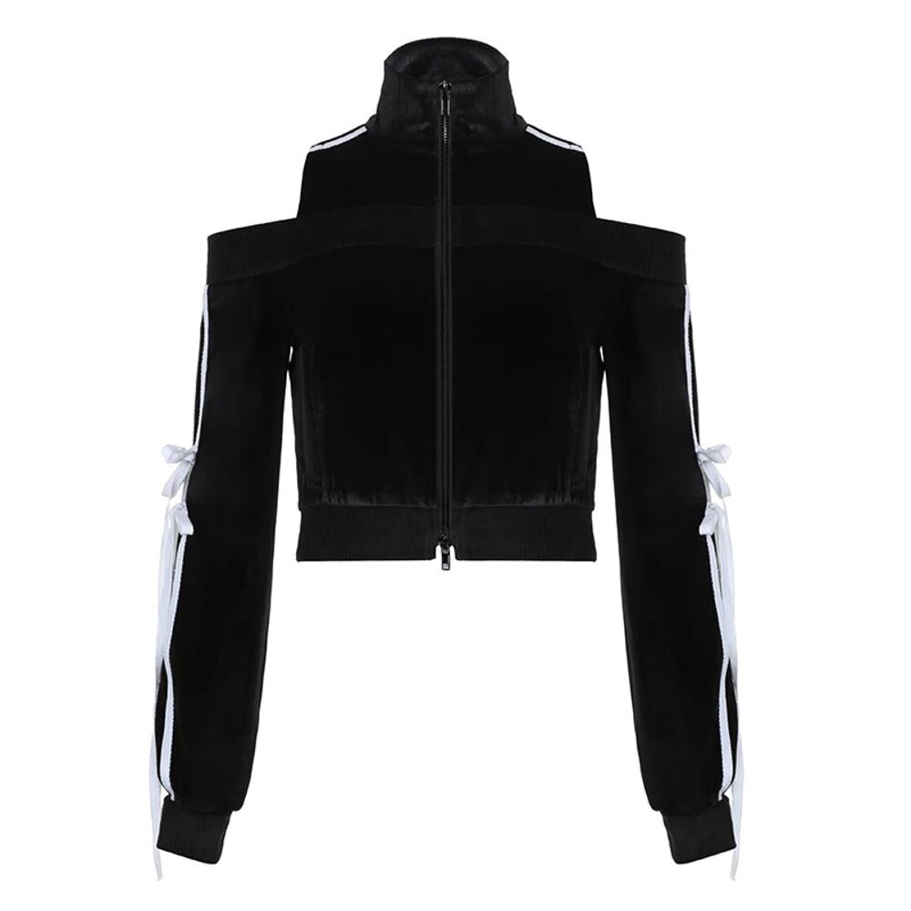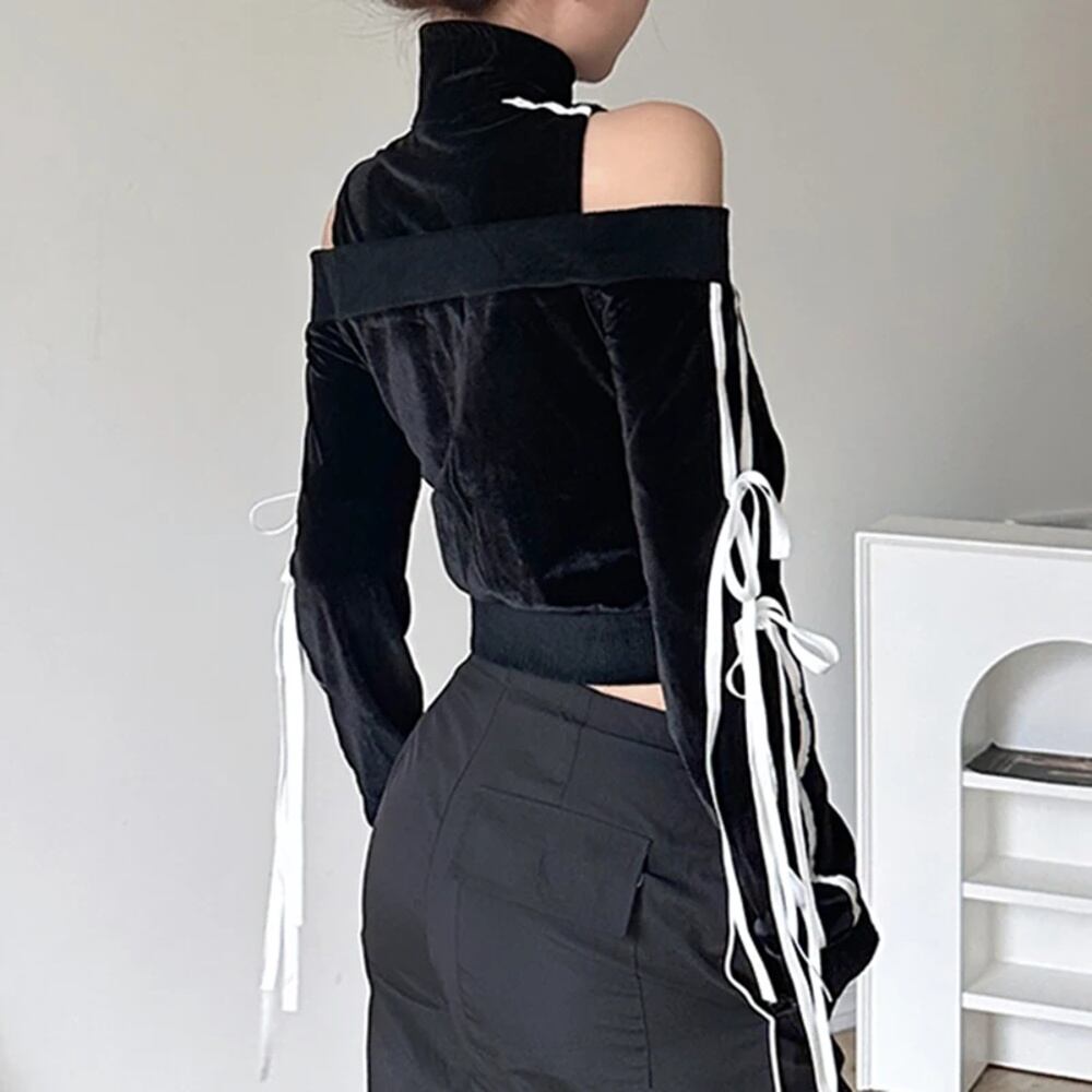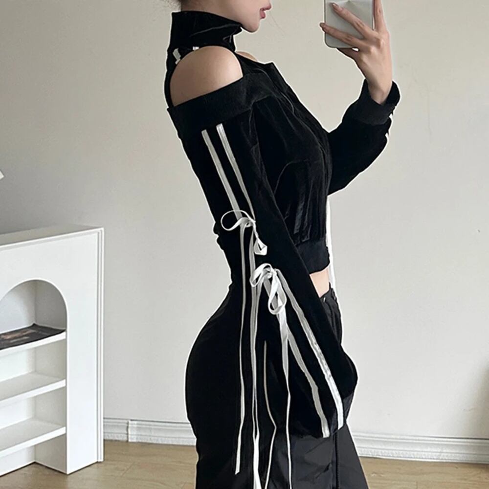 Cibbar-女性用ジッパー式タートルネックスウェットシャツ、シックなパッチワーク、包帯の弓、裸の肩のパーカー、カジュアルな衣装、黒、秋、冬、y2k パーカー ジャージ y2k T240908200428_01