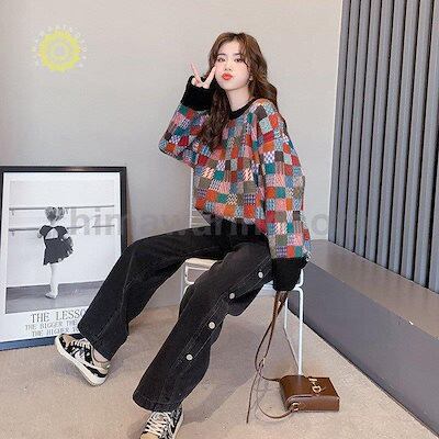 ニット トップス レディース セーター ニットセーター チェック柄 秋冬 ニットソー プルオーバー アウター 大きいサイズ セーター ドルマン お洒落 配色 可愛い