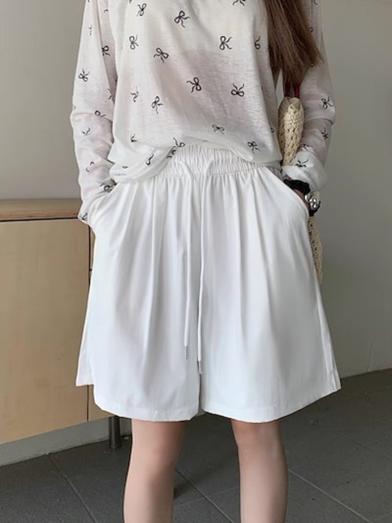 2024 春夏パンツ ハーフパンツ ワイド ストレート ウエストゴム ハイウエスト 美脚効果 脚長効果 細見え 夏 水色 黒 白 おしゃれ かわいい 韓国ファッション レディース お出かけ | HUG-L