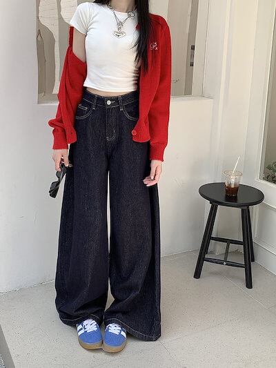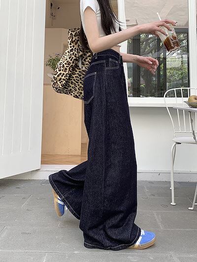 2024 初秋 デニムパンツ パンツ ロング丈 デニム ジーンズ ワイド ストレート ハイウエスト 美脚効果 脚長効果 細見え レトロ インディゴブルー レディース かわいい お 韓国ファッション | HUG-L