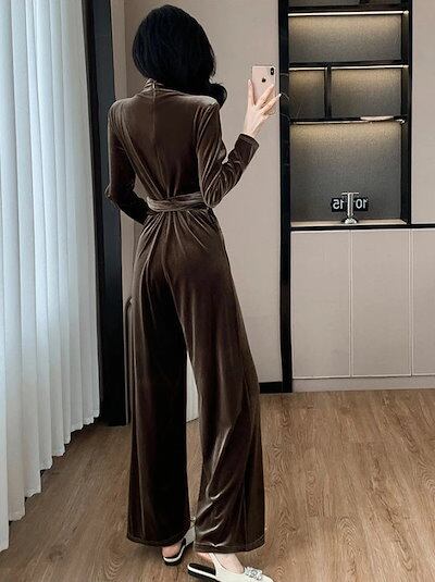 オールインワン ワイドパンツ ベルベット ベロア パンツドレス 長袖 ロングパンツ レディース フォーマル オーバーオール Vネック 春夏 春秋 体型カバー ハイウエスト フェミニン 結婚式 OL 高 | HUG-L