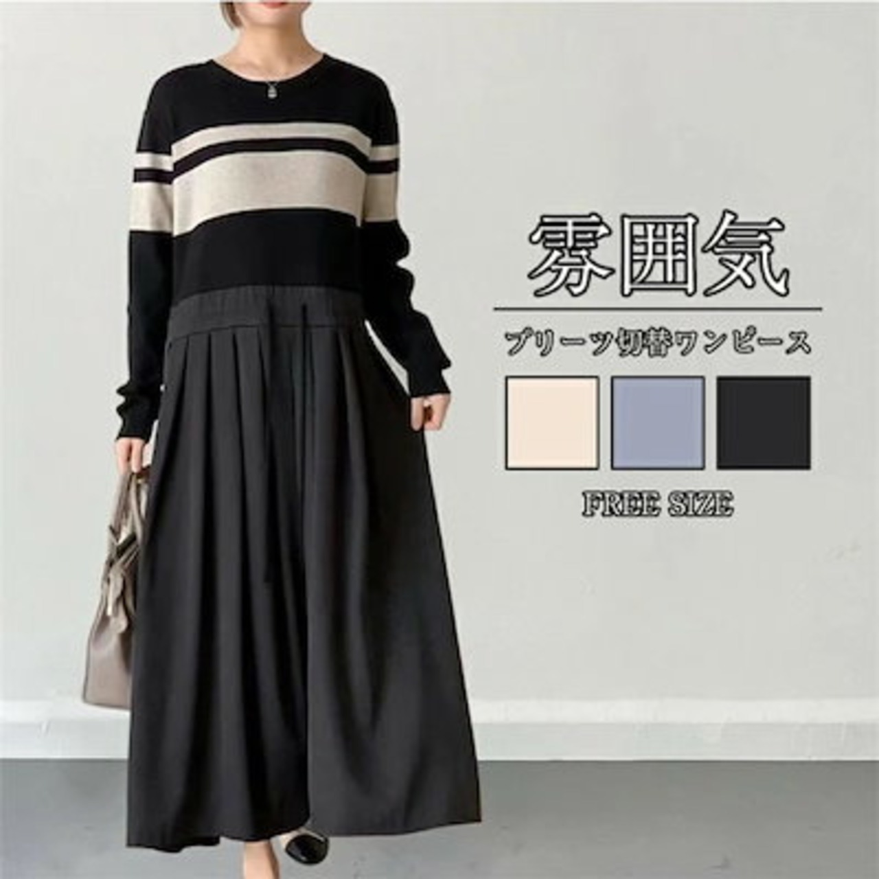 ニットワンピース レディース 秋冬 きれいめ 春 長袖 クルーネック プリーツワンピース 配色ワンピース ロング丈ワンピース ウエストギャザー切替 ワンピース きれいめ ハイウエスト プリーツ 着痩せ | HUG-L