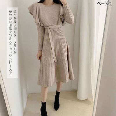 ニットワンピース レディース 長袖 秋冬 ワンピース ショルダーフリル リブ 切替ひざ丈 ミモレ丈 ロングワンピース ハイウエスト 大人 ウエストマーク フレア Aライン 秋 冬 きれいめ フェミニン | HUG-L