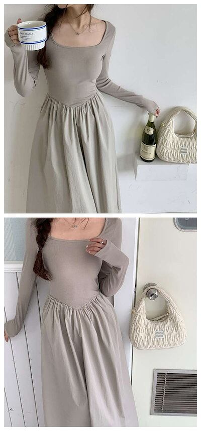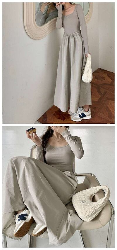 ワンピース レディース 長袖 ロングワンピ マキシ丈 マキシワンピ ロング フレアワンピ フレア 異素材 切り替え ハイウエスト aライン きれいめ 大きいサイズ ブラック グレージュ 秋冬 春秋 | HUG-L