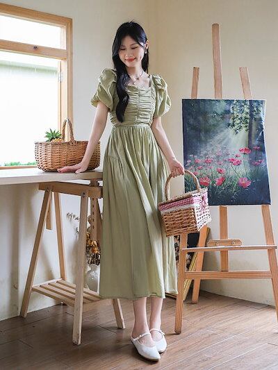 【妃】 夏 フリル ワンピース ハイウエスト Aライン 着痩せ シワデザイン レディース ロングワンピース30%までに制限